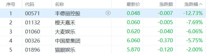 影视股下跌,丰德丽控股跌超12%,橙天嘉禾、大麦娱乐等多股跟跌。