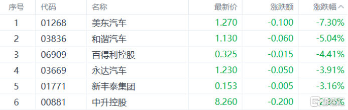 汽车股、汽车经销商股下挫,美东汽车跌超7%,和谐汽车、百得利控股等多股跟跌。