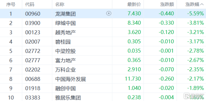 内房股走弱,龙湖集团跌超5%,万科企业、碧桂园等多股跟跌。